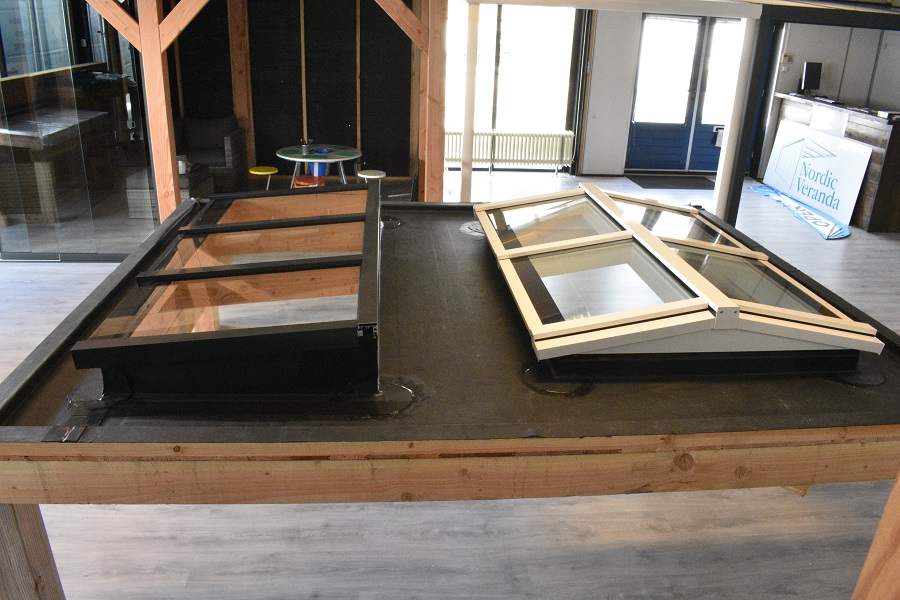 Het dak van de houten veranda bestaat uit 16 mm polycarbonaat platen, welke leverbaar in helder, opaal of zelfs een warmtewerende variant. De polycarbonaat platen worden bevestigd met brut aluminium profielen.